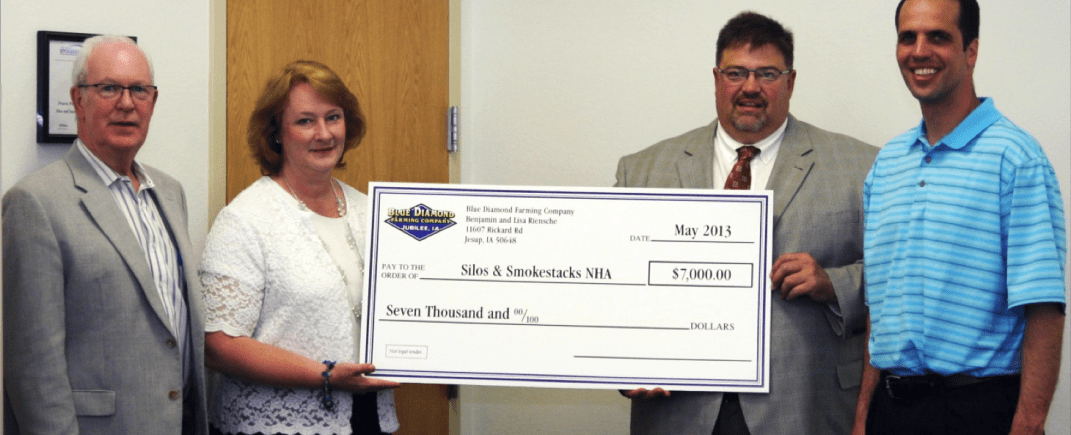 Silos & Smokestacks National Heritage Area (SSNHA) has received a $7,000 donation from Blue Diamond Farming Company, in Partnership with Pioneer-DuPont. Farm owners, Benjamin and Lisa Riensche formally presented a check to SSNHA Chairman Troy Louwagie and President Don Short during Silos & Smokestacks’ Board of Trustees meeting in Waterloo, Iowa, on May 15. The funds from their donation will be used to improve and expand Heritage Area programs dedicated to preserving and sharing America’s agricultural story.